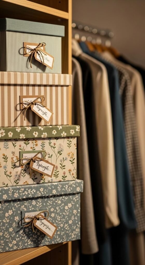 Wrap with contact paper or glue fabric using spray adhesive. Choose patterns matching your closet colors. Label each box clearly.