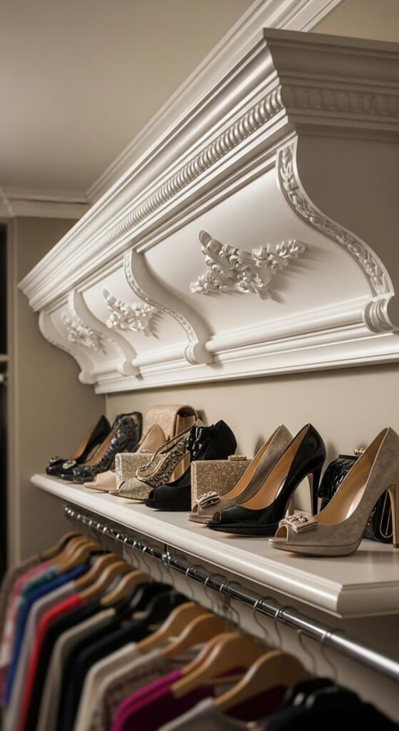 Paint the same color as walls for subtle integration. Use wood glue and finishing nails for installation. Perfect above existing shelves or around the closet perimeter. Adds architectural interest while solving storage problems.