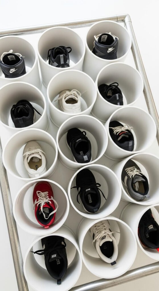 Cut PVC pipes into 12-inch segments for a shoe organizer that costs under $20. Buy 3-4 inch diameter pipes from hardware stores. Arrange them in a crate or mount between two boards.