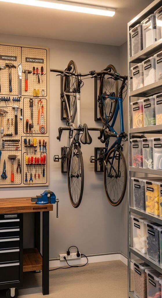 Install sturdy shelving units along walls for bins and boxes. Use pegboards for tools so you can see everything at a glance. Mount bikes on wall hooks to free up floor space. Install overhead racks for seasonal items you only access a few times a year.
