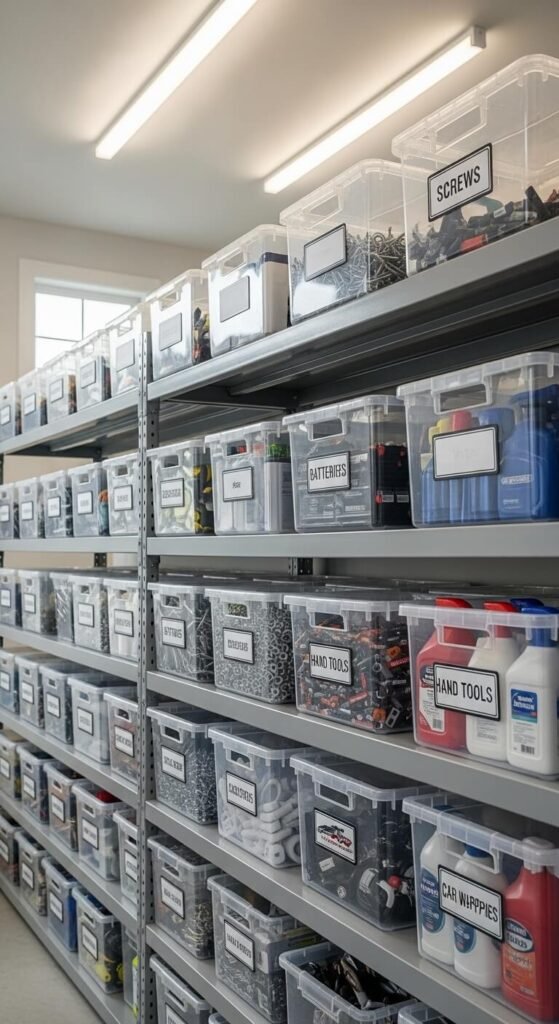 Cardboard boxes are the enemy of garage organization. They collapse, attract moisture, and hide what’s inside.