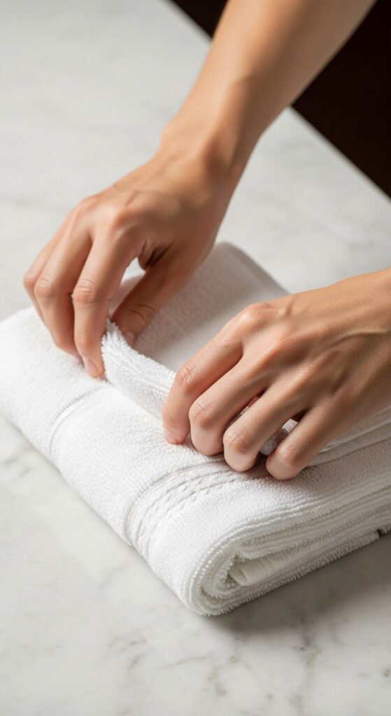 For hand towels and washcloths, use the same technique but adjust for size. The goal is to create uniform stacks that look intentional, not haphazard.