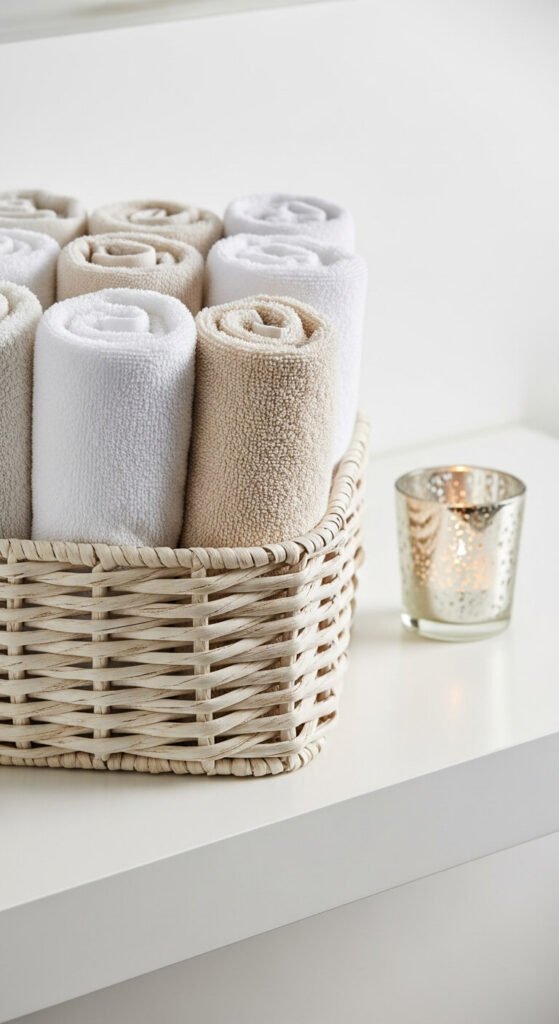 Here’s a hotel trick that’s both space-saving and visually stunning: rolling. Smaller items like hand towels, pillowcases, and washcloths can be rolled and stored vertically in baskets or bins.