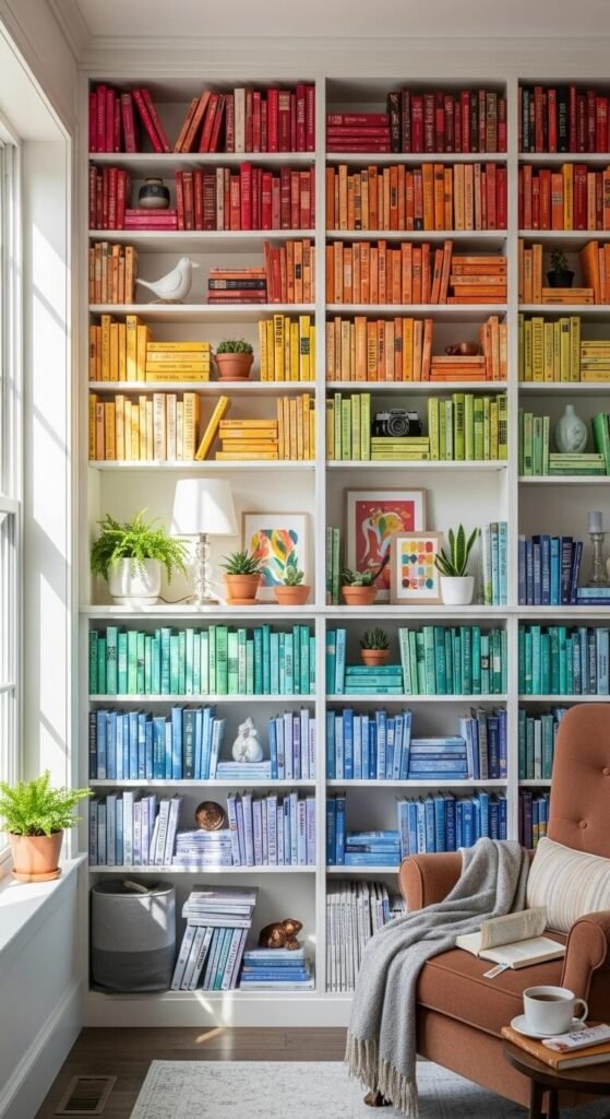 By Color: The Pinterest favorite. Arrange books in rainbow order (ROYGBIV) for a stunning gradient effect. This looks absolutely beautiful but makes finding specific titles trickier.
