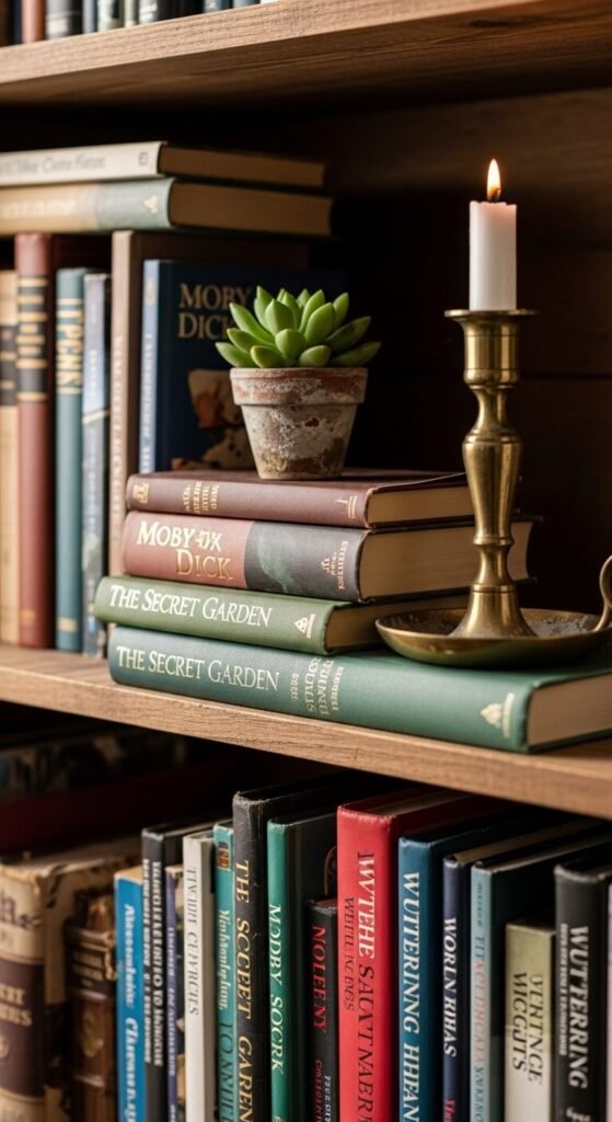 Mix Orientations: Stack some books horizontally to break up vertical rows. This creates visual interest and provides platforms for small objects.