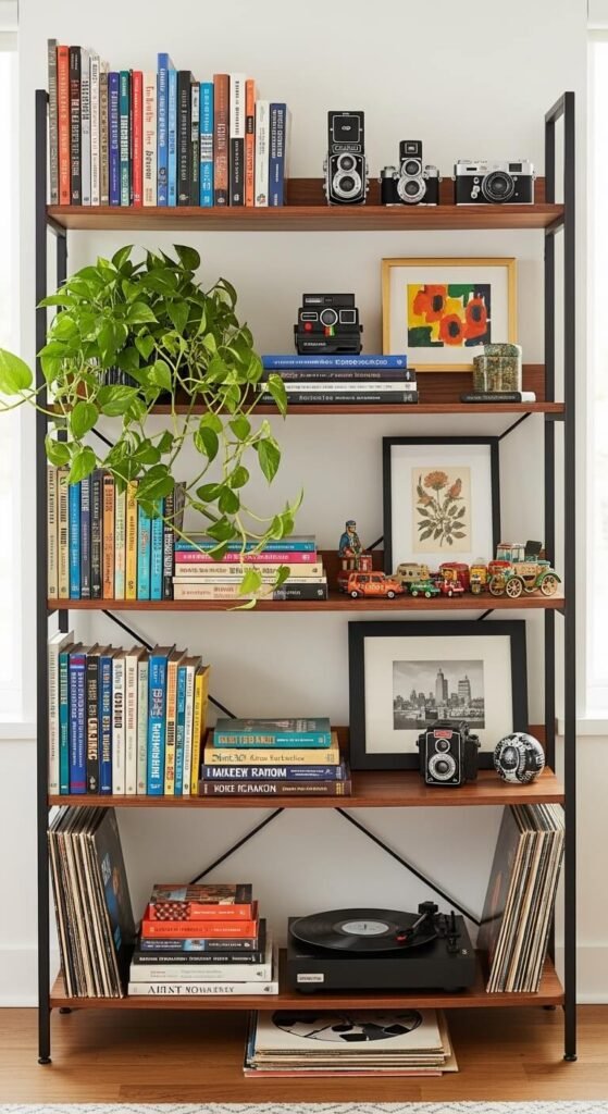 This is where your bookshelf transforms from storage into decor. The key is balancing books with breathing room and decorative elements.