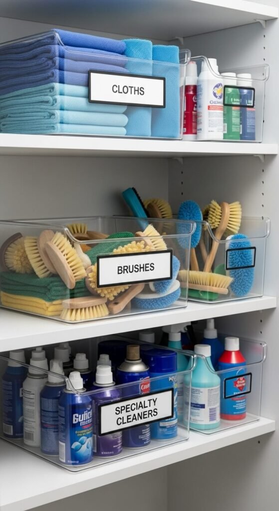 Clear storage bins are your best friend for organizing cleaning supplies. Why? You can see exactly what’s inside without opening every container.