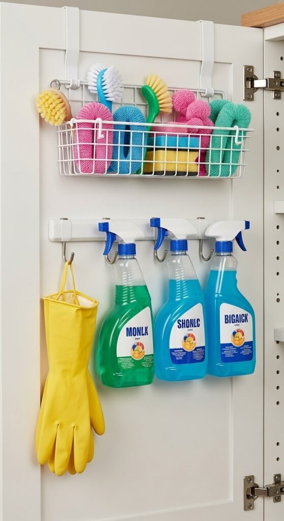 The back of closet doors is prime real estate for storage. Mount an over-the-door organizer or adhesive hooks to hold dustpans, brushes, or gloves.