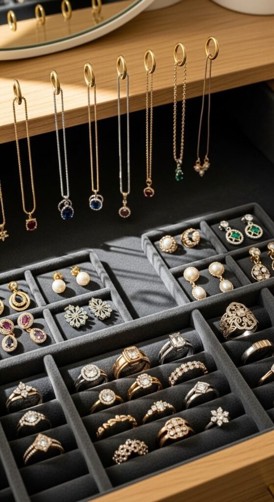 Once you have the right storage, arrange your jewelry strategically. Group similar items together—all necklaces in one area, all earrings in another. Within each category, arrange pieces by how often you wear them.