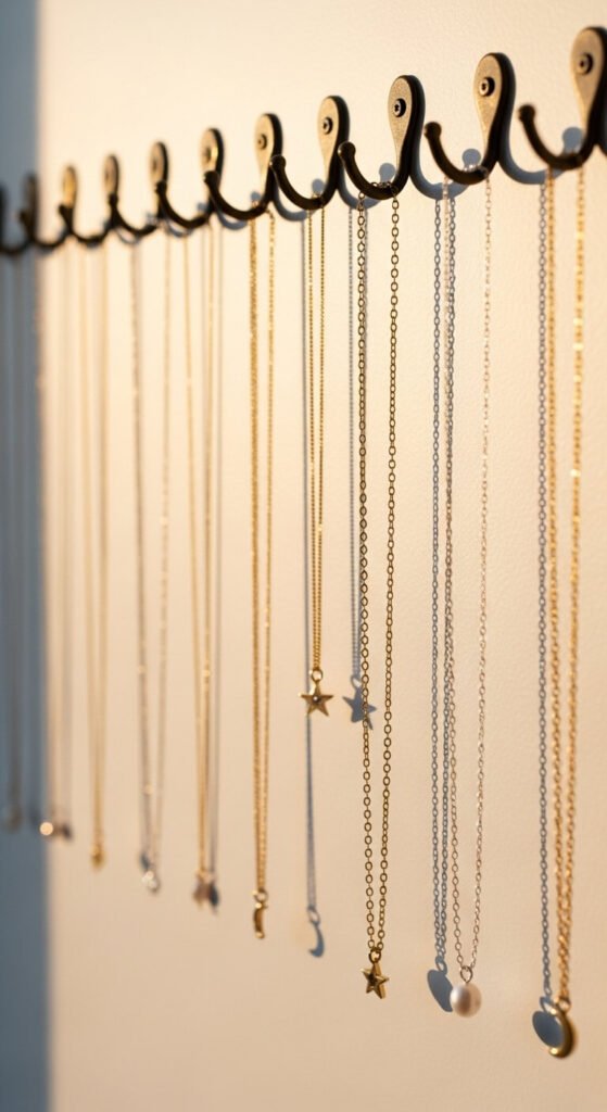 For Necklaces: Individual hooks or a wall-mounted jewelry organizer work wonders. When necklaces hang freely, they simply can’t tangle. You can use small adhesive hooks inside your closet door, install a decorative rack, or even repurpose a vintage frame with hooks attached.
