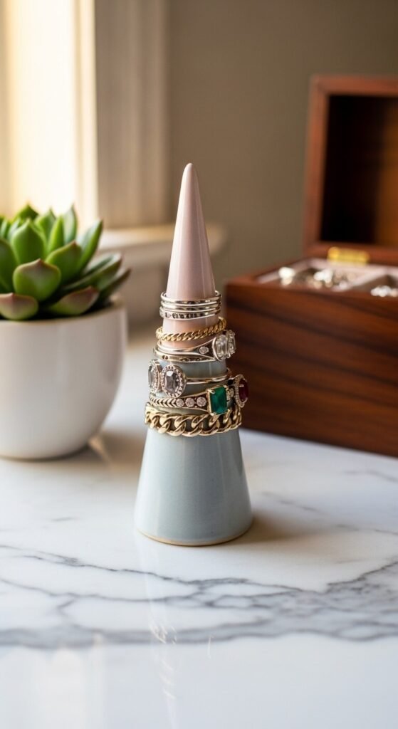 For Rings: Ring dishes, small bowls with dividers, or a ring cone display your collection beautifully while keeping each piece separate. Stackable rings can stay together, but statement rings need their own space to prevent scratching.