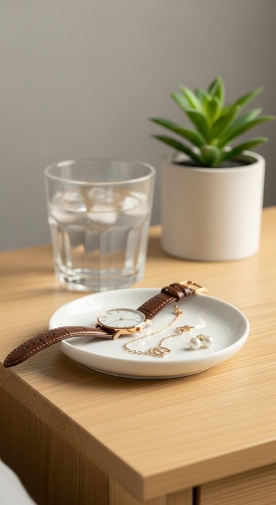 Keep a small dish or tray on your nightstand for the jewelry you remove at bedtime. Each morning, return those pieces to their proper homes before getting ready for the day. This simple routine prevents the chaotic pile-up that leads to lost and tangled jewelry.