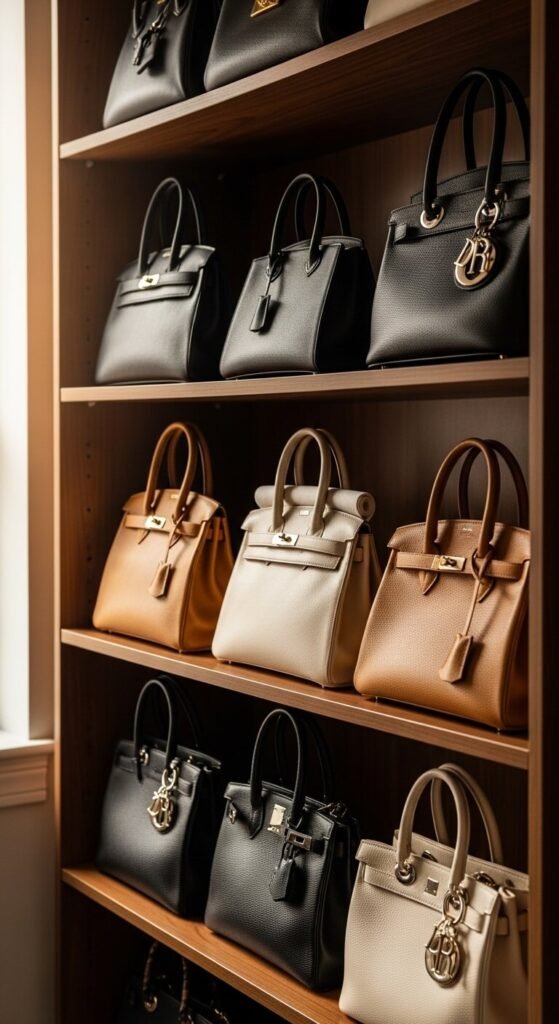 Pro tip: Use shelf dividers to keep bags from leaning into each other. Acrylic dividers work beautifully and let you see your entire collection at a glance.