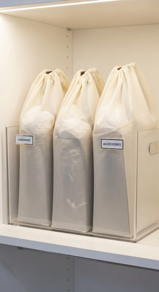 For seasonal bags or those you don’t use frequently, clear plastic bins with lids protect from dust while letting you see what’s inside. Just make sure each bag is properly stuffed and stored upright.